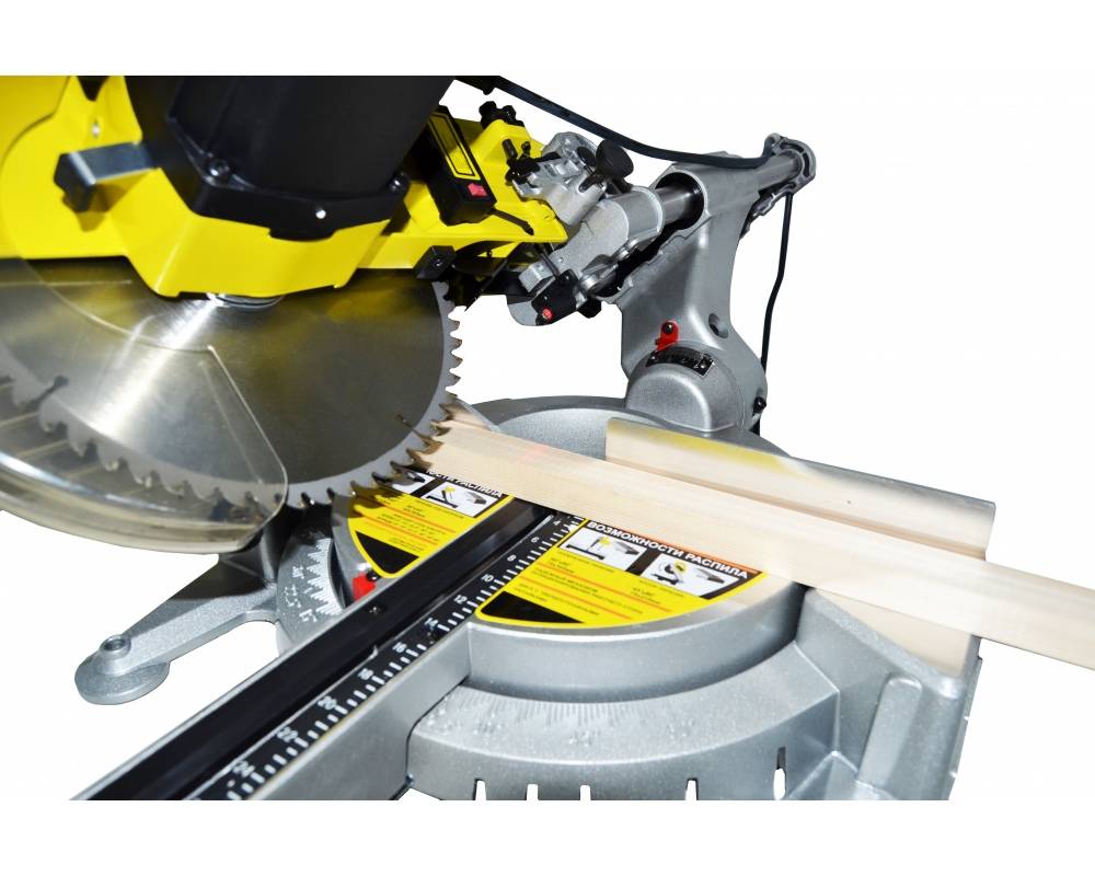 Размеры опорной поверхности устройства составляют 155 x 725 мм, поэтому на ней свободно помешаются и длинные заготовки. Ширина разреза колеблется в среднем от 80 до 120 мм, в зависимости от угла положения диска.