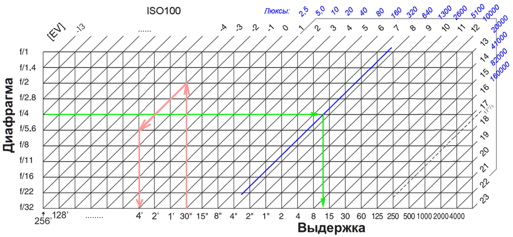 Пользоваться ей очень просто: находите пересечение строки диафрагма и столбцов выдержка (показано зелеными стрелками), затем от этого пересечения по диагонали находите EV и соответствующее ему значение в люксах (синяя линия). При желании, полученное значение EV вы можете использовать для расчета люкс по формуле (см выше). Собственно, по этой же таблице можно подобрать экспопару если известна освещенность в люксах.
