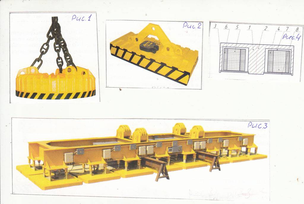 Обесточенный захват или траверза (рис.3), закреплённые на крюке крана, опускаются на свободно лежащий груз. Оператор-крановщик, включает постоянный электрический ток, подаёт его в катушки ГЭМ, создавая тем самым, магнитное поле, которое, проникая в тело груза, создаёт усилие удерживающее груз, прижимающее его к рабочей поверхности захвата, после чего груз можно транспортировать к месту обработки.