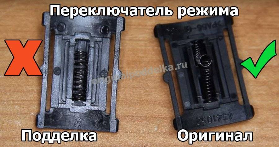 Приглядитесь внимательно, как нанесены значки в районе переключателя режимов. У оригинала значки выпуклые и аккуратные. Подделку же выдает неровная и рваная надпись, выполненная с явными дефектами.