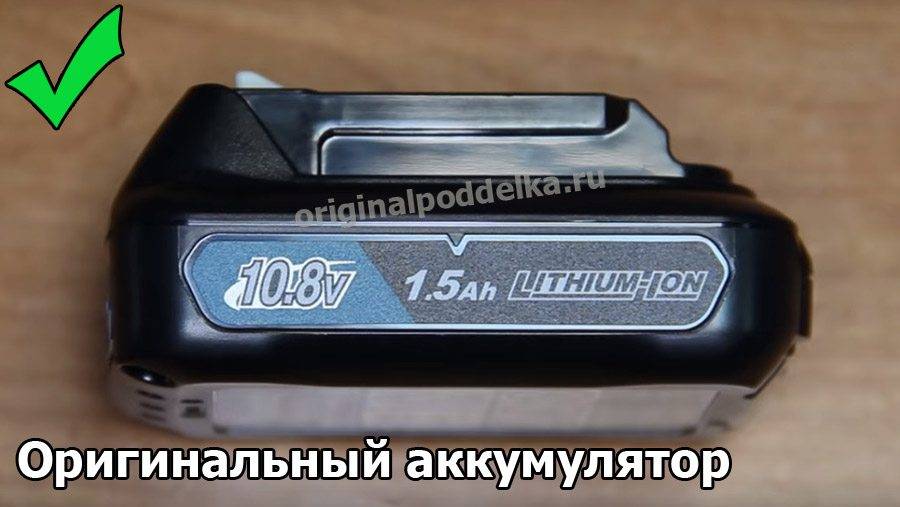Оригинальное изделие оснащается литие-ионным аккумулятором с маркировочной наклейкой. Один винт будет запломбирован, высокотоковые элементы поставляются компанией Sony или LG, мощность батареи 10.8 вольт и емкость 1.5 Ампер в час.