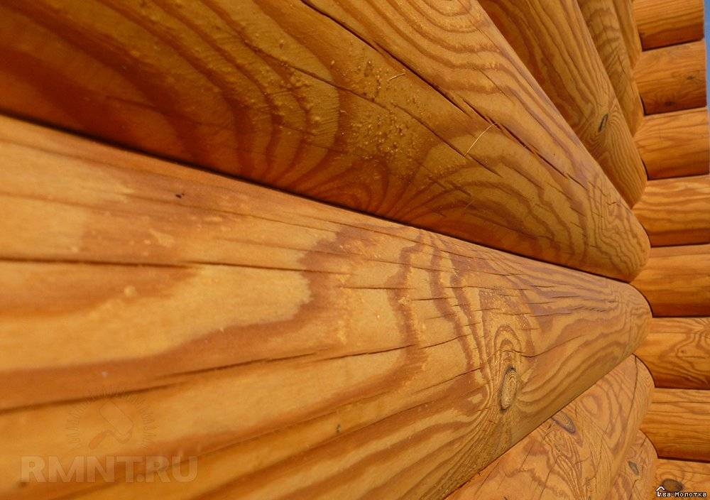 В отличие от битумных покрытий, не скрывает естественный рисунок древесины, создавая матовую поверхность с подчёркнутой текстурой шлифованного бревна.