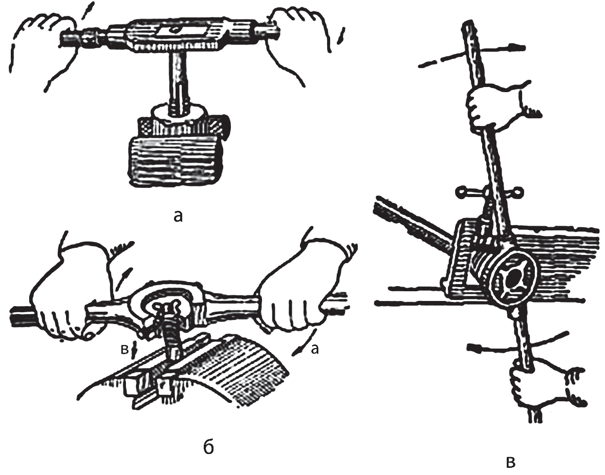 Смазанный смазкой метчик вставляют в просверленное отверстие и, слегка прижимая его к детали левой рукой, осторожно поворачивают вороток правой рукой до тех пор, пока метчик не захватит металл и его положение в отверстии не станет устойчивым. После этого вороток берут двумя руками и вращают с перехватом рук через каждые полоборота (рис. 10, а)