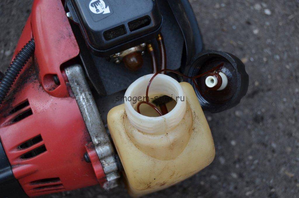 Перед запуском двигателя бензиновой косы проверьте наличие, и качество топливной смеси. Не экономьте, не жадничайте и «не умничайте» в этом вопросе. Ремонт или замена поршневой группы обойдется вам слишком дорого (иногда до 70% стоимости нового инструмента). Готовить масляно-топливную смесь нужно строго по инструкции. Рассчитывайте ее количество из реальных потребностей. Лишний бензин, оставшийся после работы с течением времени теряет свои качества.