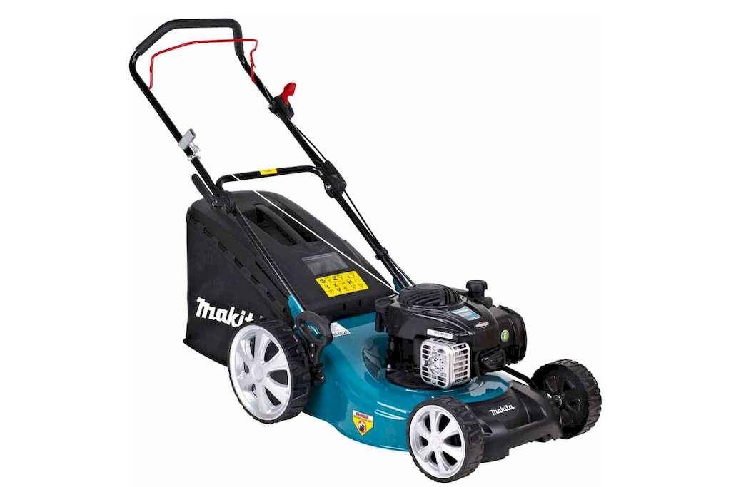 Трава вылетает прямо в травосборник, не предусмотрена функция бокового выброса. Модель Makita запускается с помощью ручного стартера, оснащена регулятором высоты скоса.