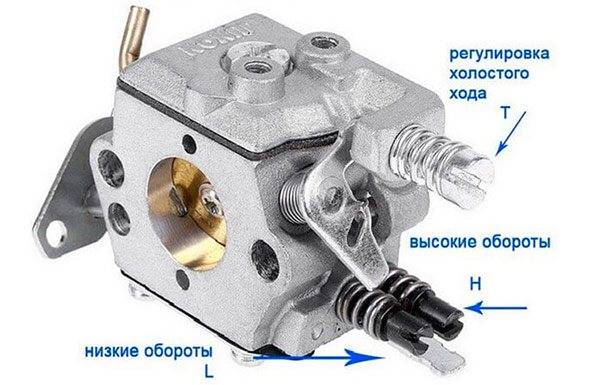 Общий вид карбюратора бензопилы Husqvarna и регулировочных винтов: