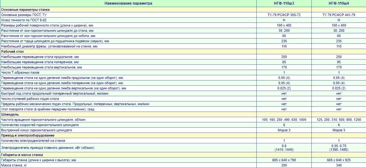 Фрезерный станок НГФ-110Ш4 выпускается по ТУ-79 РСФСР 441-79 и заменил устаревшую модель фрезерного станка НГФ-110Ш3, который выпускался по ТУ-79 РСФСР 355-72.