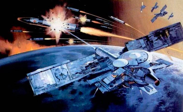 По мнению художника «звездные войны» между СССР и США будут идти вот так. В реальности – СССР сделал не больше 3-х десятков космических «бомбардировщиков», а США свою ПРО так и не достроили
