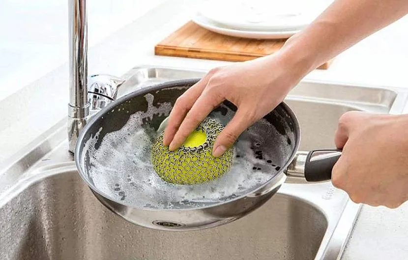 Мытье посуды жесткой мочалкойИсточник biolshop.com.ua