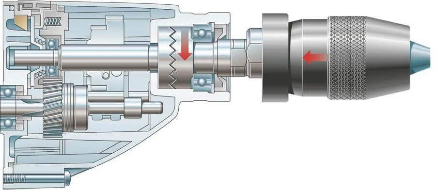 Смыкание храповиков происходит в момент установки специального переключателя в положение удара. Когда один из них вращается, зубчики заставляют их немного расходится друг от друга, а затем снова сходится. При больших оборотах это ощущается как вибрация. В итоге создается дополнительное усилие, которое дает возможность с легкостью просверлить кирпич или газобетон. Для такого сверления требуются специальные сверла с твердосплавным наконечником.