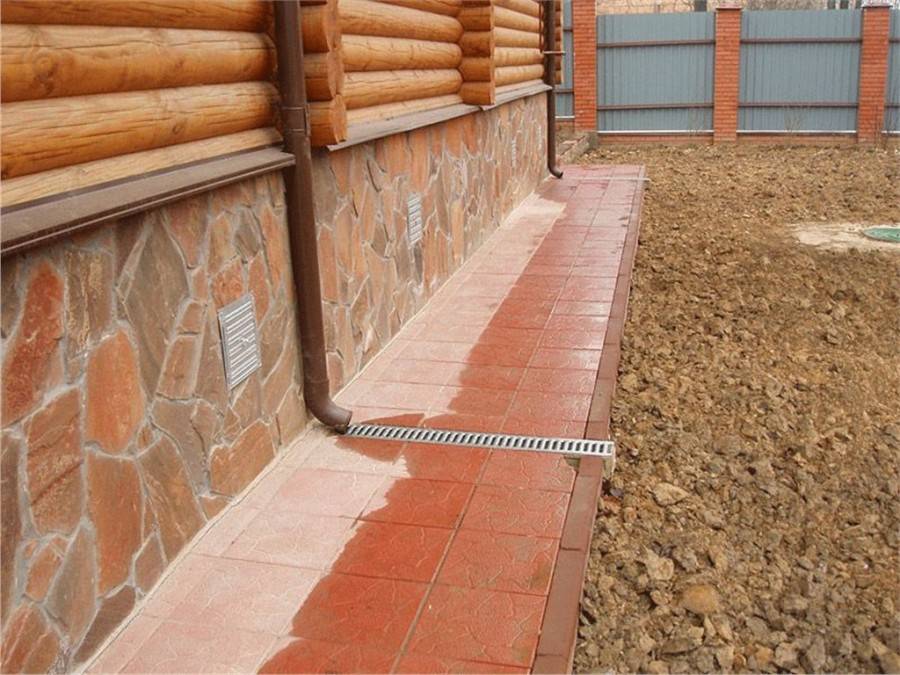 Если слой гидроизоляции продлить под всей опалубкой и вывести его в водоотводную канавку, то можно использовать материалы, пропускающие воду – слой щебня, гальки, тротуарную плитку, брусчатку и т. п.