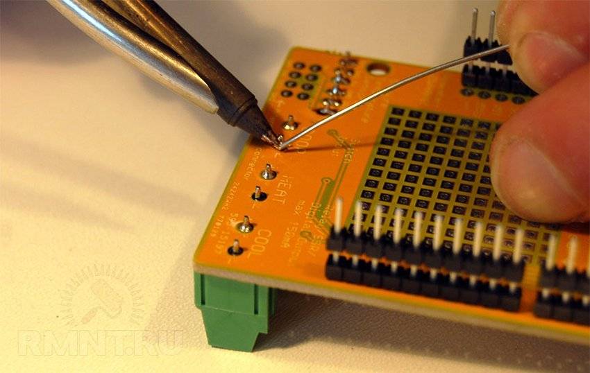 Нагревание соединения для улучшения теплопроводимости металла. Жало паяльника необходимо на несколько секунд прислонять к компонентам схемы