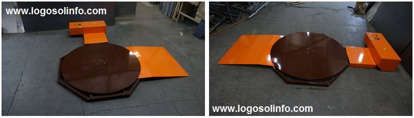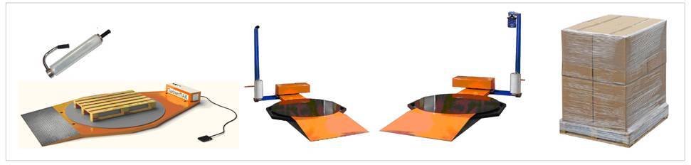 - Поворотного стола, на котором устанавливаются штучные грузы, подлежащие упаковке (чаще всего выполняется их обматывание прочной стрейч-плёнкой, из-за чего данные устройства иногда называют паллетообмотчиками).