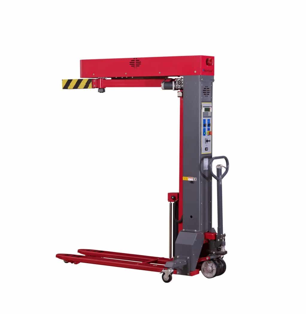Ручной паллетоупаковщик удобен в применении – его легко подкатить непосредственно к грузу. Обвязка поддонов производится стрейч-пленкой, расположенной на поворотной руке. Максимальный вес груза составляет 1 т, в минуту устройство совершает до 12 циклов обвязки. Управление производится с жидкокристаллического дисплея, заряда аккумулятора хватает до 10 часов. Каретка оборудована регулируемым механическим тормозом.