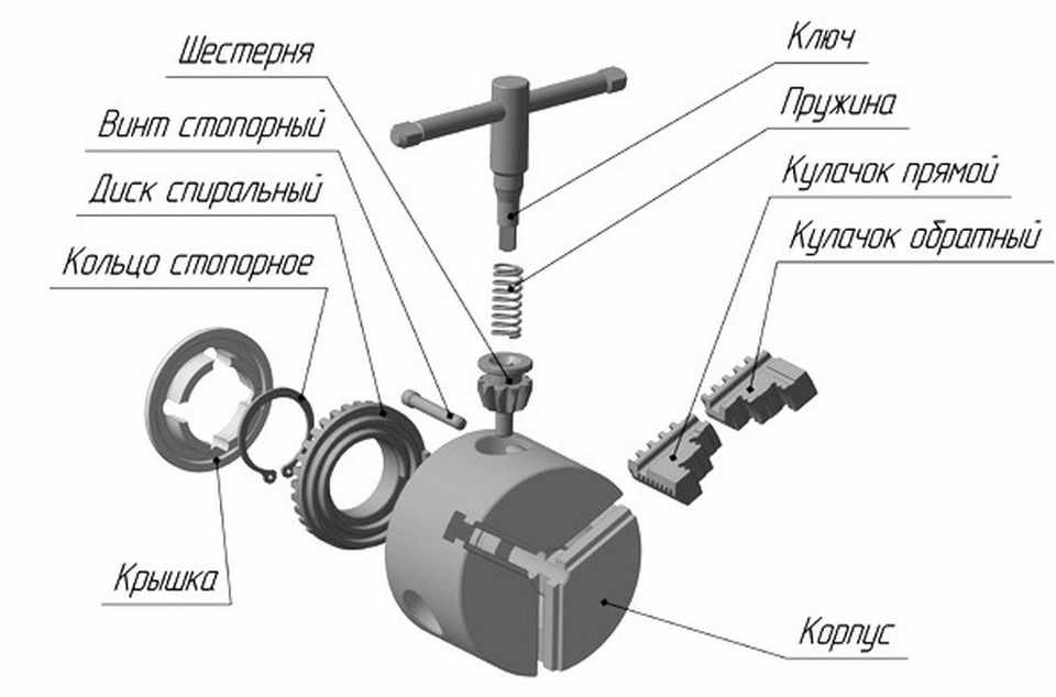 Кулачки перемещаются посредством диска, который на одной своей части имеет пазы «архимедова спираль», а с другой стороны, находится коническое зубчатое колесо, взаимодействующее с остальными колёсами.