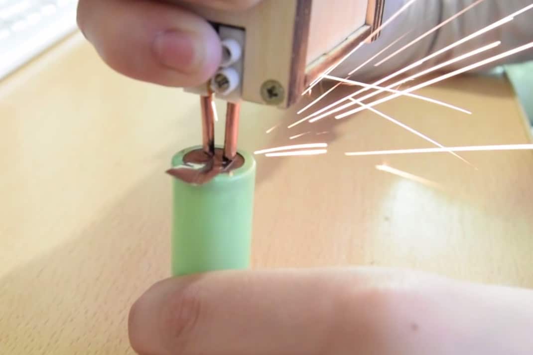 Наиболее безопасный способ соединения банок — это точечная сварка. Ее суть состоит в следующем: к месту сварки прижимаются электроды. Через них в течение небольшого промежутка времени пропускается большой ток. За это время металл пластины успевает расплавиться и привариться к батарее. При этом тепло не успевает проникнуть внутрь аккумулятора и причинить ему вред.