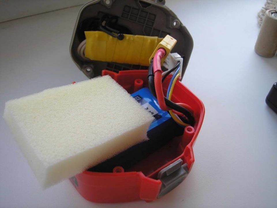 ![]() | Остается поджать блок питания к какому-либо краю, чтобы при работе не возникало тряски. Просверлить вентиляционные отверстия. Собрать аккумуляторный блок. |