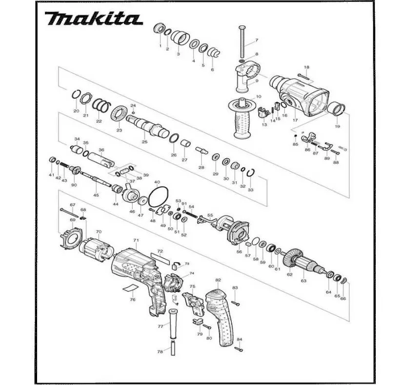 Детальная комплектация к приведенной схеме, которая поможет понять, как разобрать перфоратор Makita: