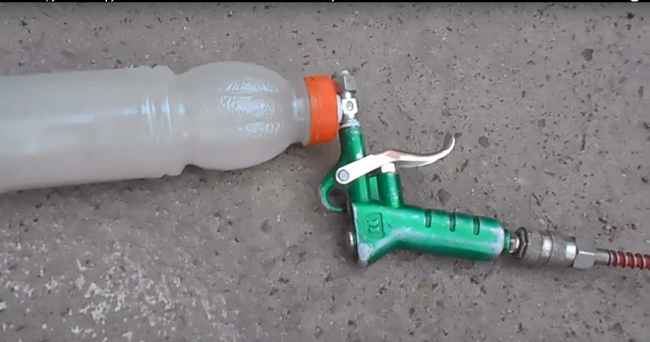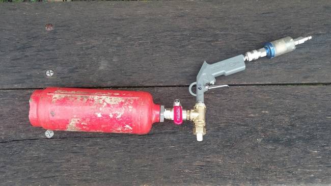 В качестве емкости для абразива может использоваться как легкий баллон от порошкового огнетушителя, так и пластиковая бутылка.