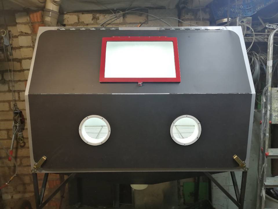 - Необитаемые агрегаты. Это малогабаритные боксы, которые по высоте не превышают роста оператора. Они состоят их металлических стенок, смотрового стекла, отверстия для сопла пескоструя, двух резиновых перчаток, закреплённых внутри камеры. Оператор находится снаружи, управляет всеми процессами с помощью закреплённых перчаток.