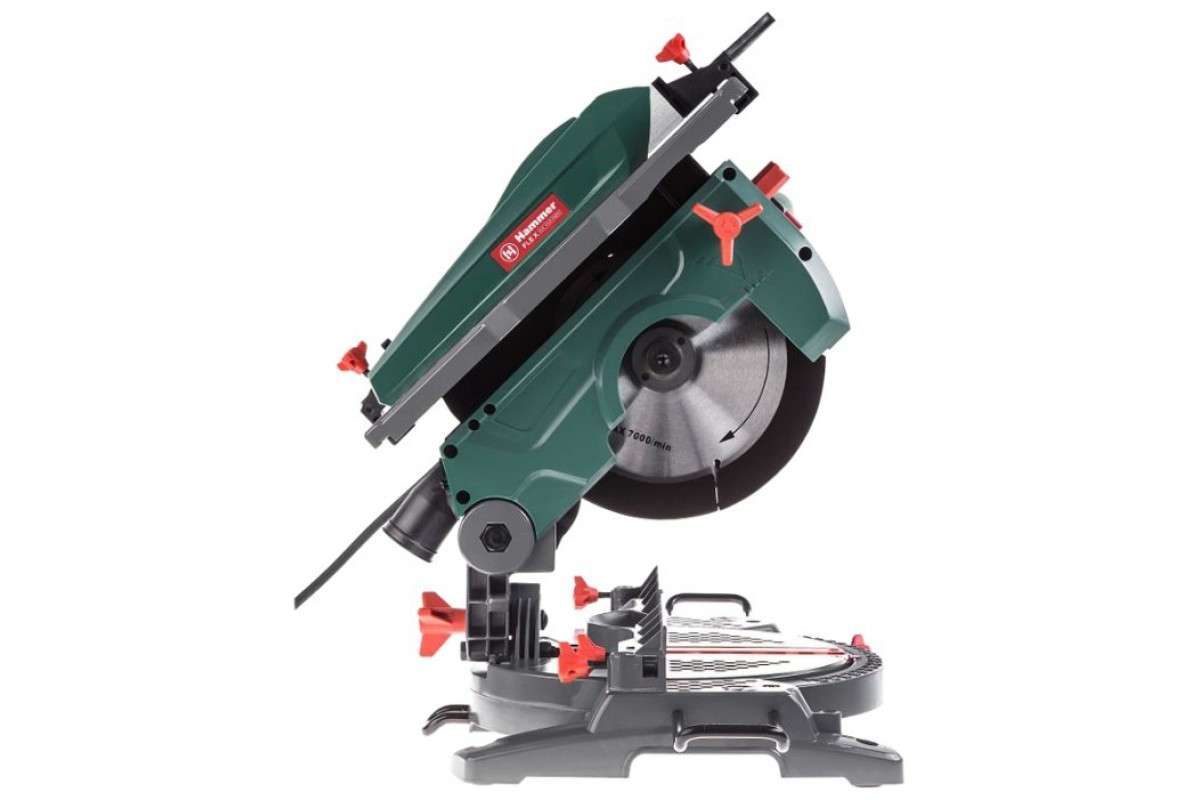 Характеристики: диаметр оснастки – 216, мощность 1500, скорость вращения – 5000 оборотов, глубина пропила под прямым углом – 65, под 45° – 36 мм. Есть регулировка глубины реза. Пила имеет наклон пильной головки влево на 47°, вправо на 2°. Стол с регулировкой положения на 47° в обе стороны. Стол снабжен расширителями для длинных заготовок, для их надежной фиксации есть специальный зажим. Снабжена лазерной направляющей и мощной светодиодной подсветкой для повышения точности проводимого распила. Специальные зажимы на рабочем столе надежно фиксируют брус. Блокировка шпинделя позволяет безопасно менять расходник, снимать защитный кожух нет необходимости. Корпус изготовлен из алюминиевого сплава, что обеспечивает надежность. В целом, это неплохой вариант из среднего ценового сегмента с необходимым набором функций. Плавный пуск и система поддержания оборотов стали бы неплохим дополнением, однако производителем они не предусмотрены.