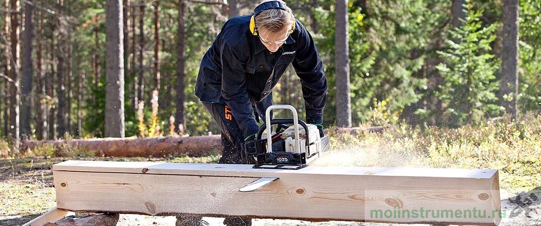 Для процесса заготовки лесоматериалов можно использовать мощную цепную или ленточную бензопилу: