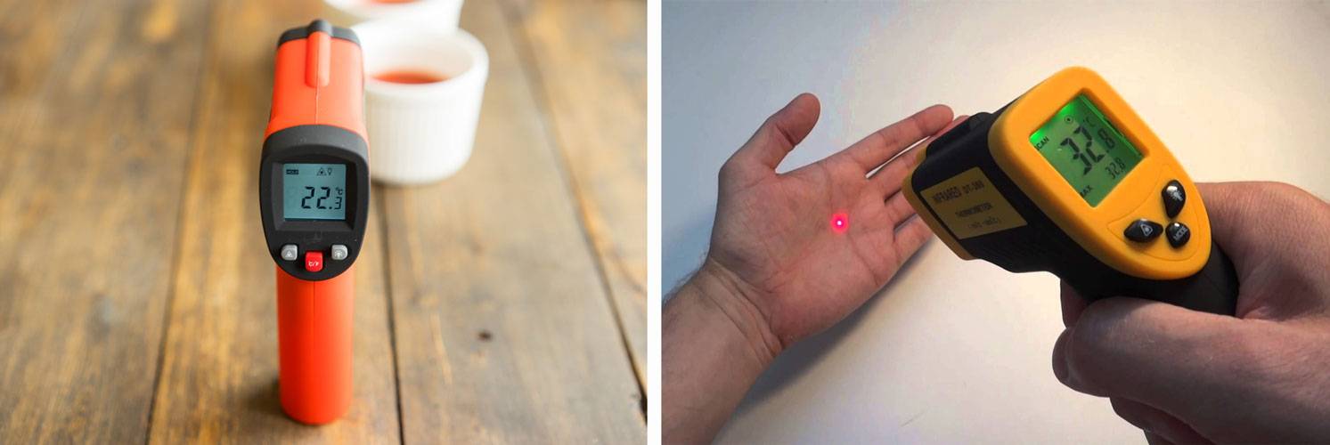 При выборе пирометра для производства выпечки в цехе или дома можно купить бесконтактный прибор с диапазоном от — 50 до + 400 °С. Но лучше всего в кулинарии себя показывают модели с термопарой, ее подсоединяют к основному блоку и проводят замер контактным способом, чтобы получить наиболее точные результаты. Потом тест повторяют дистанционно для сравнения показателей, разница достигает обычно нескольких градусов.