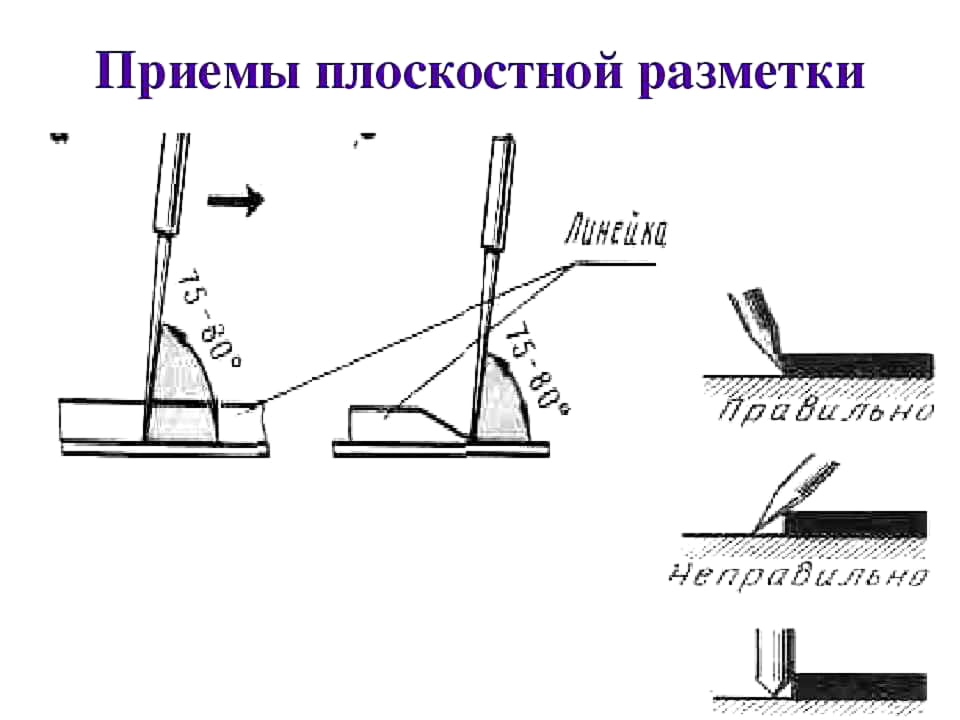 Обычно при прочерчивании рисок чертилку держат с двойным уклоном: один на 15—20° от вертикали в сторону от линейки (или шаблона), другой в-сторону перемещения чертилки так, чтобы угол между ней и заготовкой (деталью) составлял 45-70°.