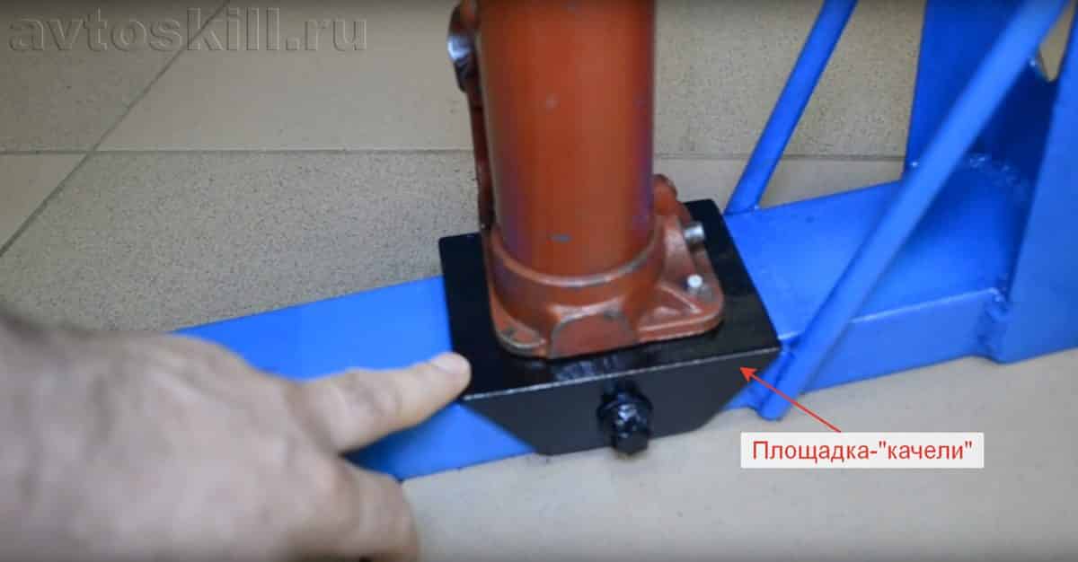 Бутылочный домкрат рекомендуется устанавливать на подвижной площадке-«качелях», так как в процессе работы домкрат немного меняет свой угол, и требуется некая компенсация движений. Площадка должна немного раскачиваться из стороны в сторону. Сделать её можно из того же швеллера, просверлив сквозное отверстие в подъемной основе и посадив «качели» на болт так, чтобы оставался небольшой зазор в 0.5-1 см между основой и площадкой.
