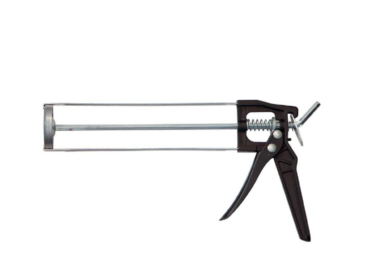 Данный тип упаковки для герметика в тубе выделяется доступной стоимостью, но применим нечасто или даже один раз. Основанием для пистолета применяются сталь и пластмасса. Представляет собой устройство две рамы, которые соединяются кольцом. Штоковая деталь может быть гладкой, шестигранной или зубчатой.