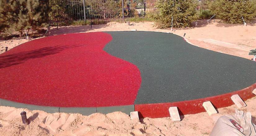 При укладке в покрытия два слоя нет необходимости в нижний добавлять пигмент для резиновой крошки, поэтому смесь для него изготавливают без краски. Для увеличения упругости покрытия может применяться резиновая крошка более мелкой фракции (0,5-2,5 мм). Это повышает удельный вес (снижает пористость) и делает нижний слой более жестким.