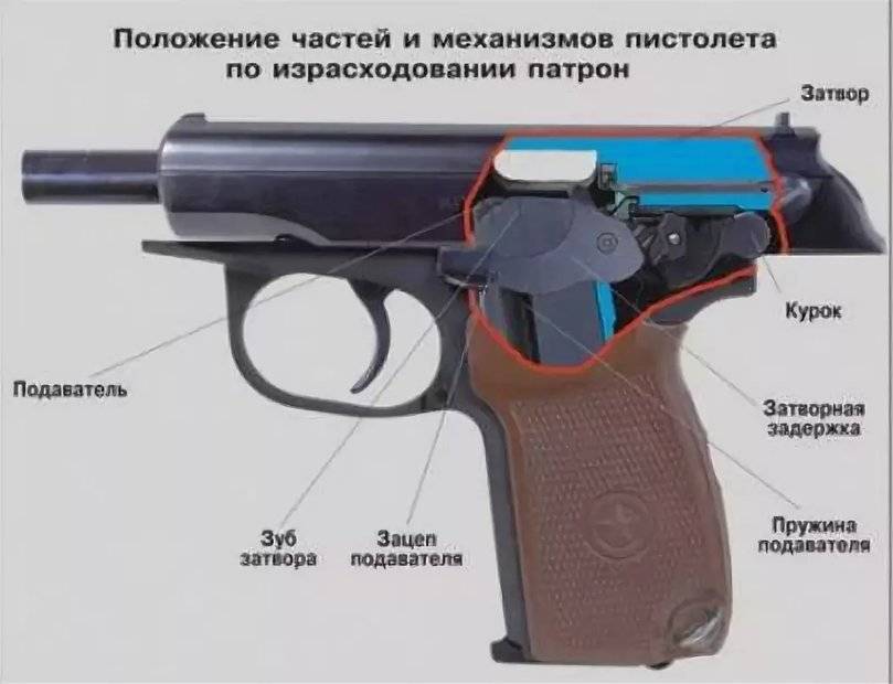Выстрелы из пистолета Макарова производятся до тех пор, пока не израсходуются все патроны в магазине. После этого затвор становится на затворную задержку в задней позиции.
