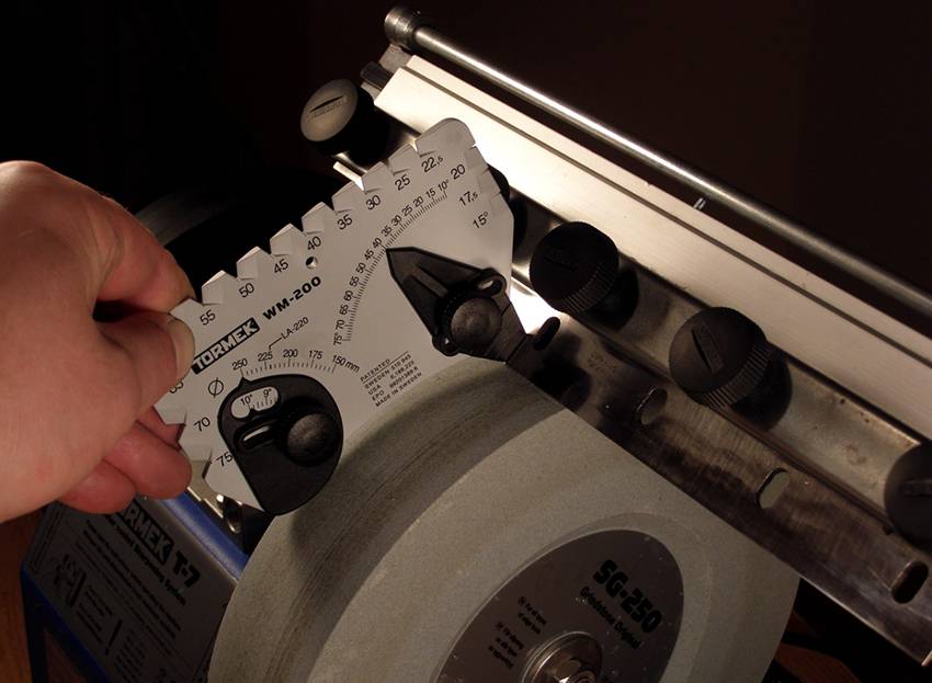 Следующий шаг – выбор угла заточки. Здесь мы ориентируемся на таблицу выше и берём диапазон от и до. Не забывайте, чем меньше угол заточки, тем быстрее нож затупится. Для новичка будет сложно выдержать одинаковый угол