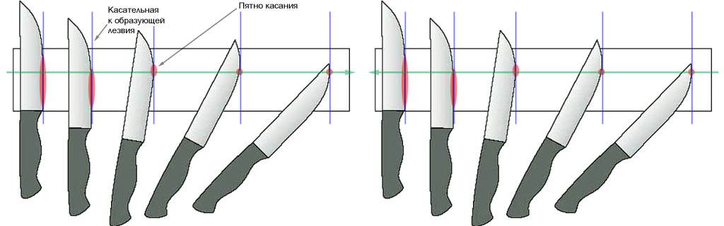 Пушпульная заточка бережет клинок, но требует от оператора высокого умения, т.к. в процессе заточки нужно непрерывно и точно соблюдать ряд условий, см. также рис. ниже: