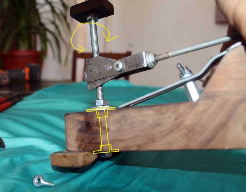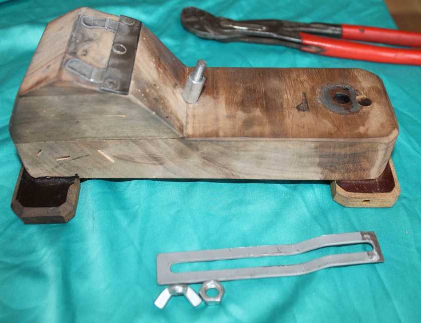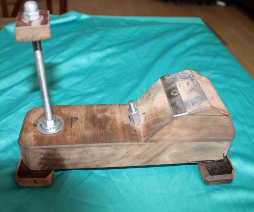 Далее прикрепляем к станине вертикальный отрезок шпильки и неподвижно закрепляем на нём «сухарь» Состоящий из двух деталей выполненных эбонитового бруска (Сухарь — очень важная деталь, он определяет угол, под которым будет соприкасаться абразивный брусок и затачиваемое лезвие).
