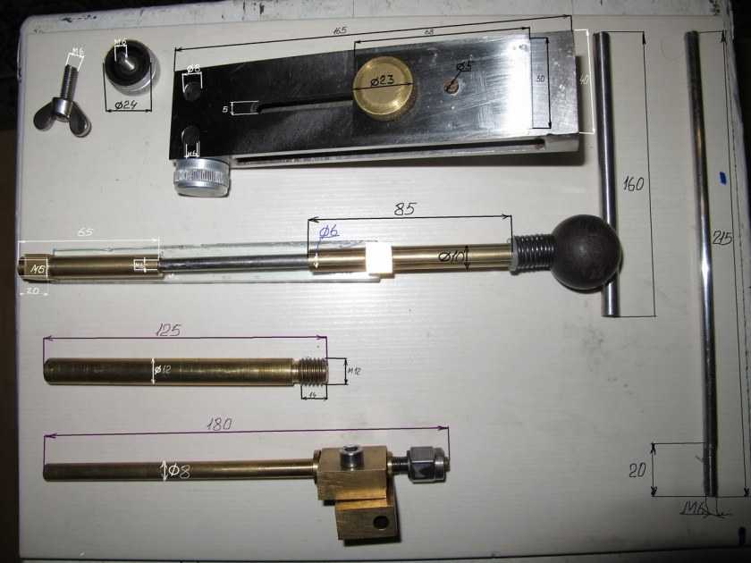 - Также вам понадобится небольшой брусок из текстолита или эбонита для создания подвижного соединения шпильки со станиной, которое можно будет регулировать по высоте (при необходимости его можно будет заменить бруском выполненным из твёрдых пород древесины например, это может быть дуб, бук или граб);
