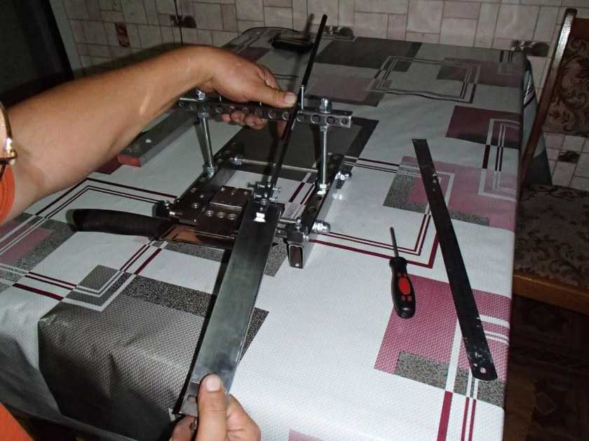 - Используя поворотный механизм, подставляют вторую сторону клинка под брусок.