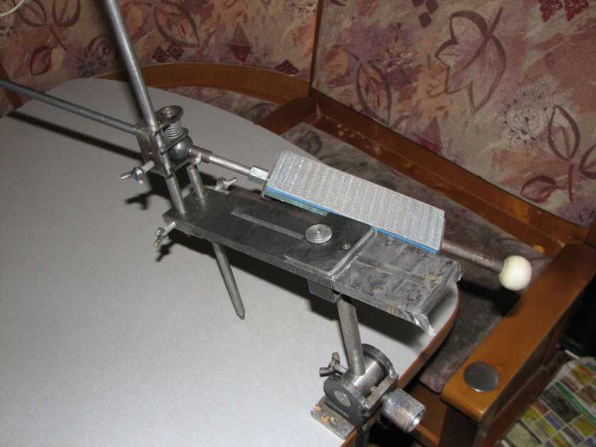 Поворотный держатель для точилки крепится ближе к краю основания. Расстояние от клинка до вертикальной направляющей можно регулировать, чтобы удобнее было менять положение затачиваемого инструмента. Поворотный механизм закрепляется по желанию под углом 90 и 180 градусов. Нож зажимается двумя тисками в виде губок.