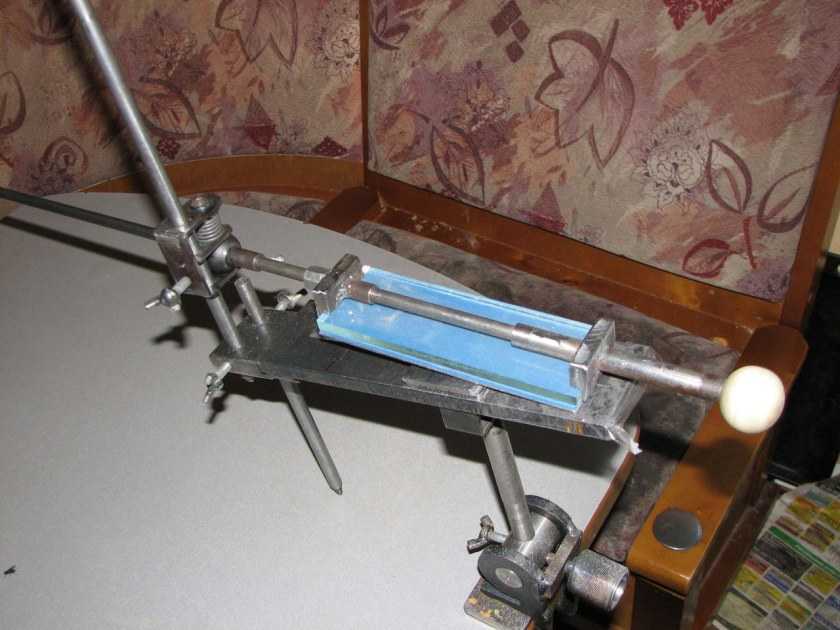 Направляющий стержень длинный, брусок зажимается в нем металлическими ограничителями. В комплекте есть камни абразивностью 120, 350, 600 и 1500 грит. Его стоимость – 4-5 тыс. р.