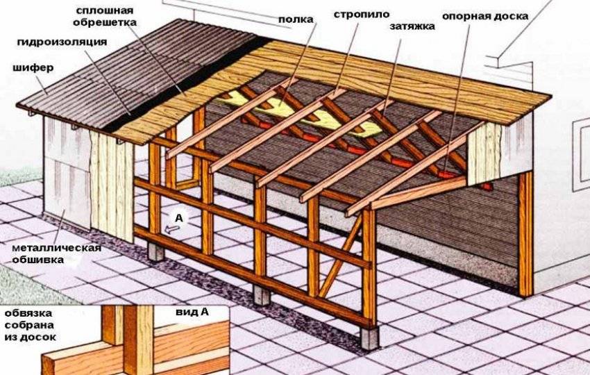 - из бруса формируют угловые и промежуточные стойки, при этом те, которые прилегают к стенке, располагают на 50 см выше остальных, чтобы кровля имела наклон.