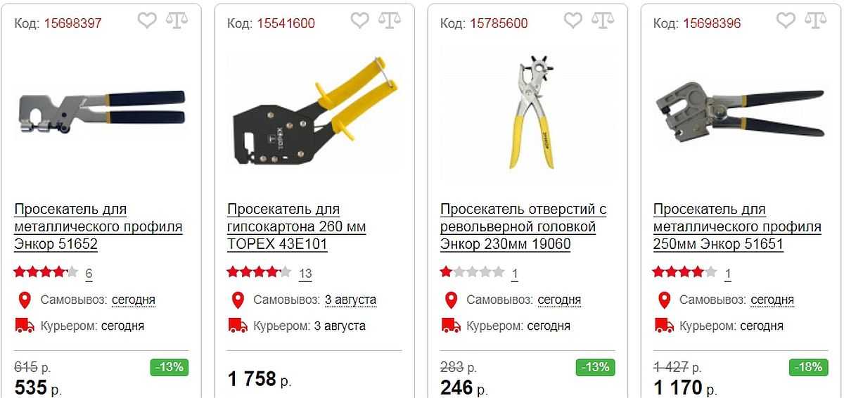 - ЭНКОР 51652 (500 руб.) — двуручный инструмент отечественного бренда, произведенный в Китае, предназначен для соединения металлического профиля толщиной 0,5 — 0,8 мм методом просечки с отгибом, ручки имеют антискользящее покрытие, длина просекателя 300 мм.