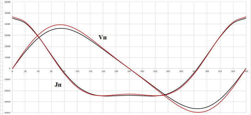 Где ϕ — угол поворота коленчатого вала в градусах.Зависимость от длинны шатуна присутствует в обеих формулах, я не стану расписывать решение пошагово. Все равно считал все в Екселе. Покажу сразу график