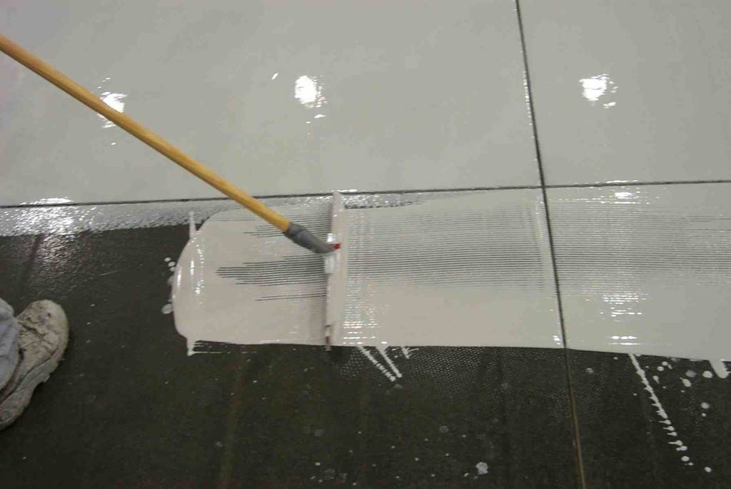 Приготовленный полимерный раствор выливается на стяжку параллельными стене полосами, начиная от дальнего угла комнаты. Раствор достаточно жидкий, чтобы выравниваться самостоятельно, но использование ракли нужно для того, чтобы выдержать одинаковую толщину раствора на всей поверхности основы.