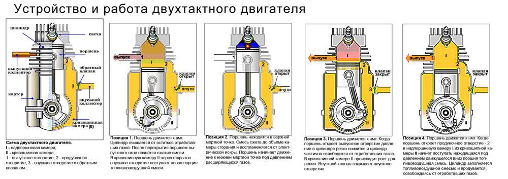 - Газораспределительная система. Отвечает за поступление топливной смеси в цилиндр.а также за вывод отработанных газов наружу. В качестве газоотвода выступает глушитель.