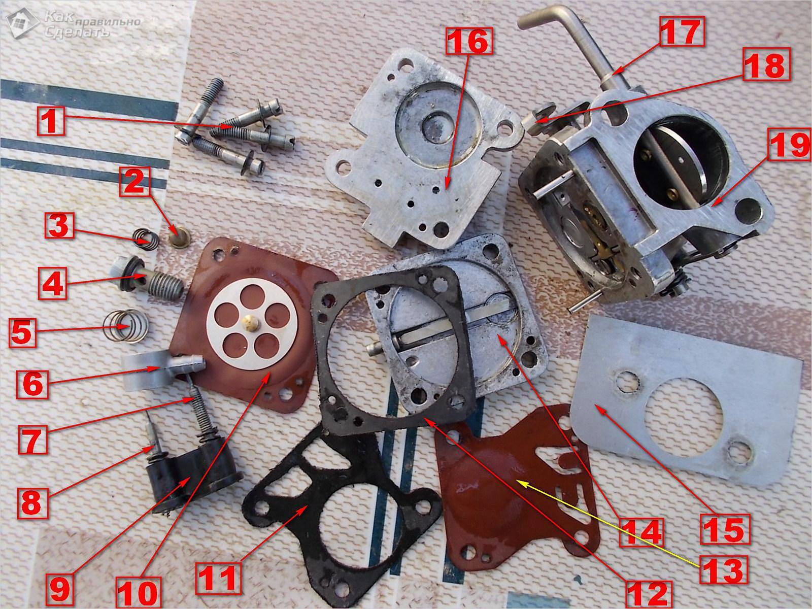 Устройство разных моделей карбюраторов практически одинаково, поэтому при работе с ними можно пользоваться стандартной схемой. Все элементы нужно снимать аккуратно, а затем выкладывать по приведенному ниже порядку, чтобы можно было удачно расставить предметы на место по окончании ремонтных работ.