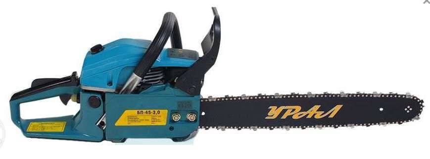 Помимо классической модели с мощностью 5 л.с. выпускалась интересная бензопила Урал БП-45-3.0, которая была отличным помощником в домашнем хозяйстве. Вес устройства был немного уменьшен, имеется неплохая комплектация в виде дополнительных храповика и масло привода. Мощность двигателя уменьшили до 3 л.с. или 2,3 кВт.
