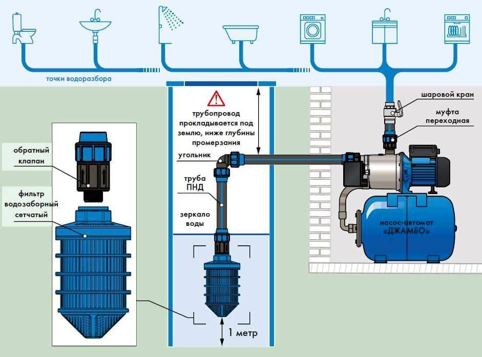- Диаметры труб закладываются большего размера, если вода транспортируется из дальнего источника. Максимальная глубина уровня жидкости не должна превышать 4 м.