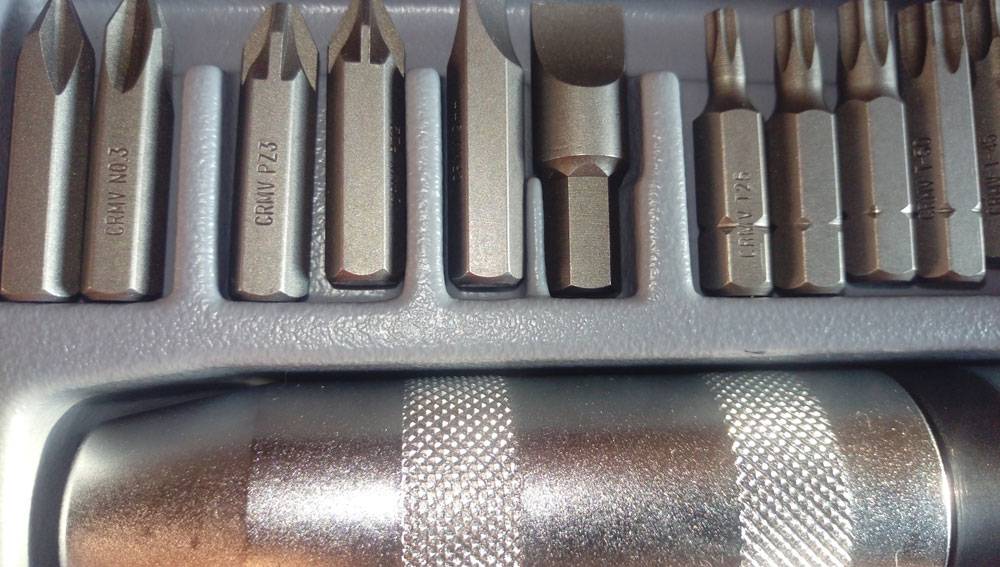 Как правило, она входит в комплект, простейший из которых состоит из специальной рукоятки и набора различных бит (наконечников).