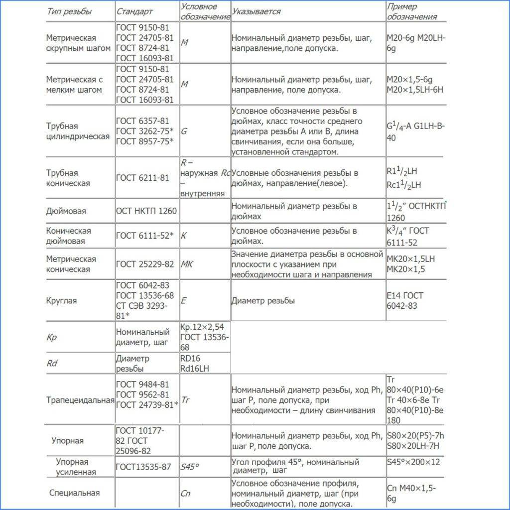 Типы резьб — сводная таблица нормативных актов и маркировка