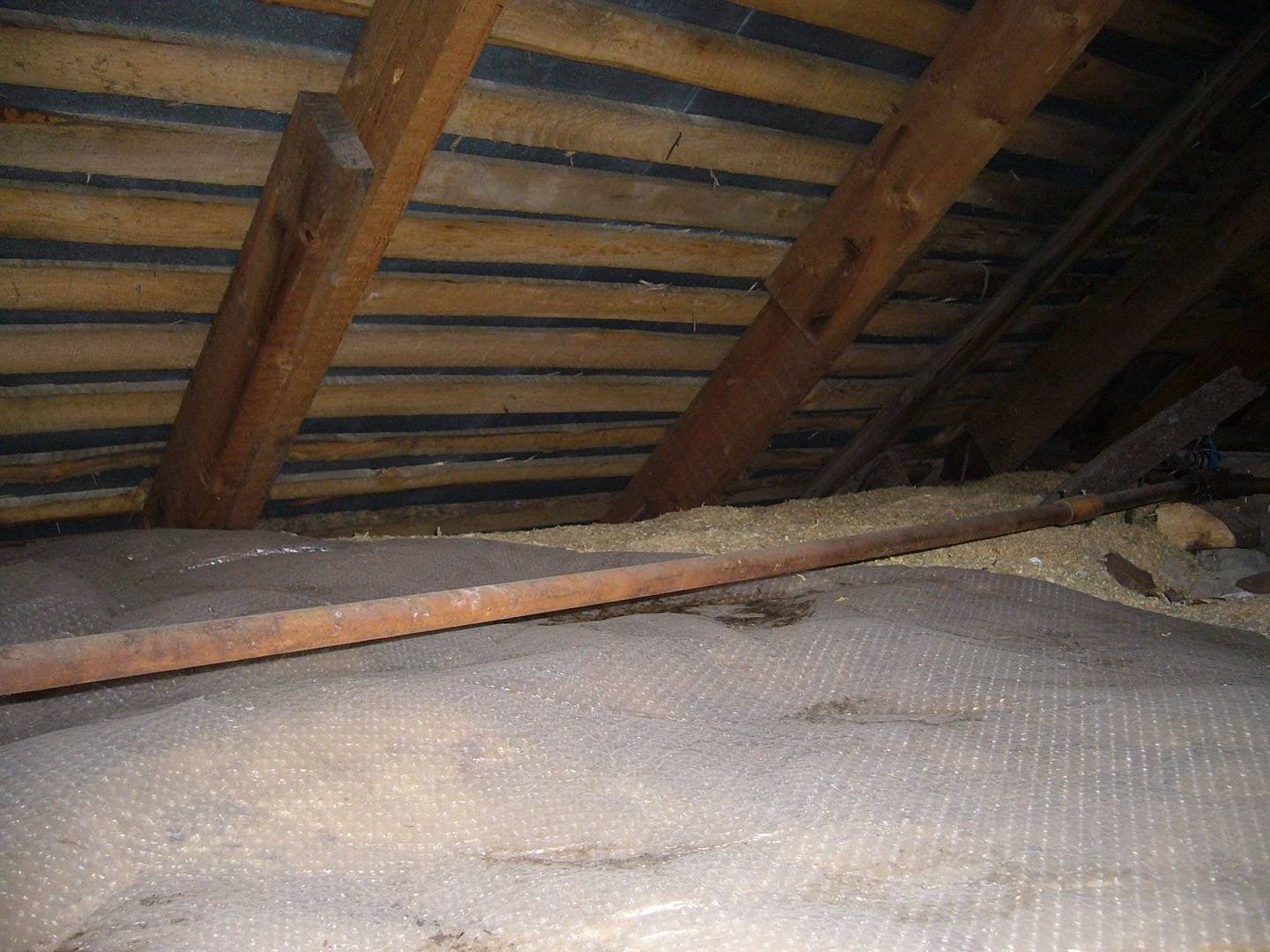 - Подняться на чердак и внимательно осмотреть, освещая яркой лампой, изоляцию кровли с внутренней стороны — протечки и набухшие от влаги стропила видны невооружённым глазом. Если повреждение старое, то на поверхности стропил будут заметны тёмные пятна.